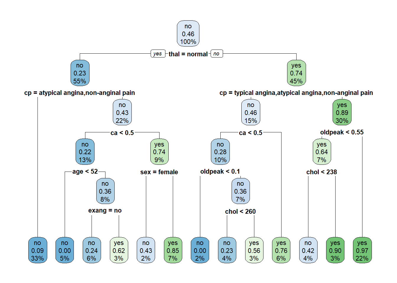 5) cp=typical angina,asymptomatic 67 29 no (0.56716418 0.43283582)