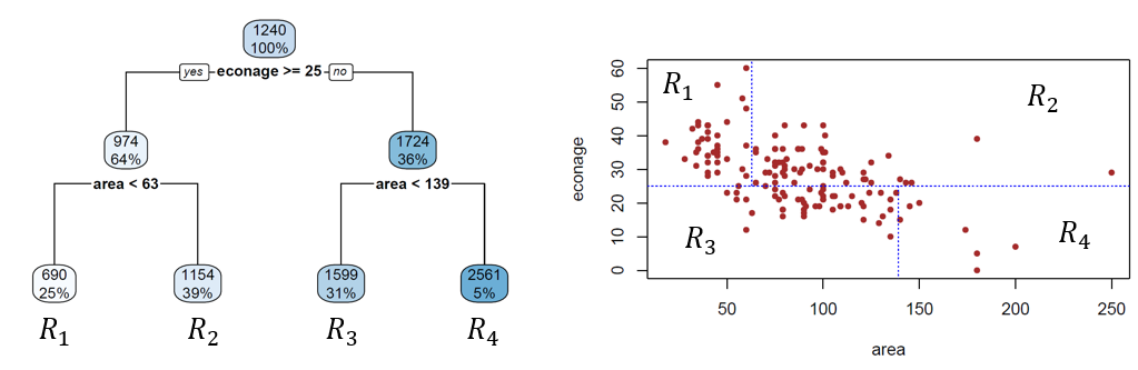 Wichtig: dieser erste Split segmentiert den Input Space nun in zwei Regionen (Rechtecke), wie im rechten Teil der Abbildung dargestellt. Das wichtigste Take-Away hier ist, dass ein Split im Baum einer Segmentierung des Input Spaces entspricht! Weil wir hier nur die Variablen econage und area betrachten, können wir diesen Input Space ohne Probleme in 2D visualisieren.