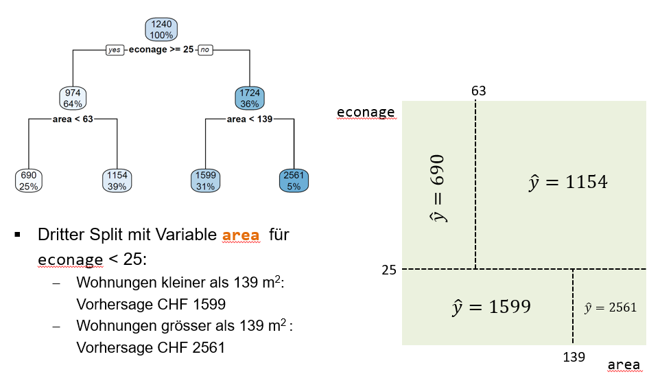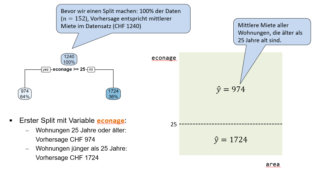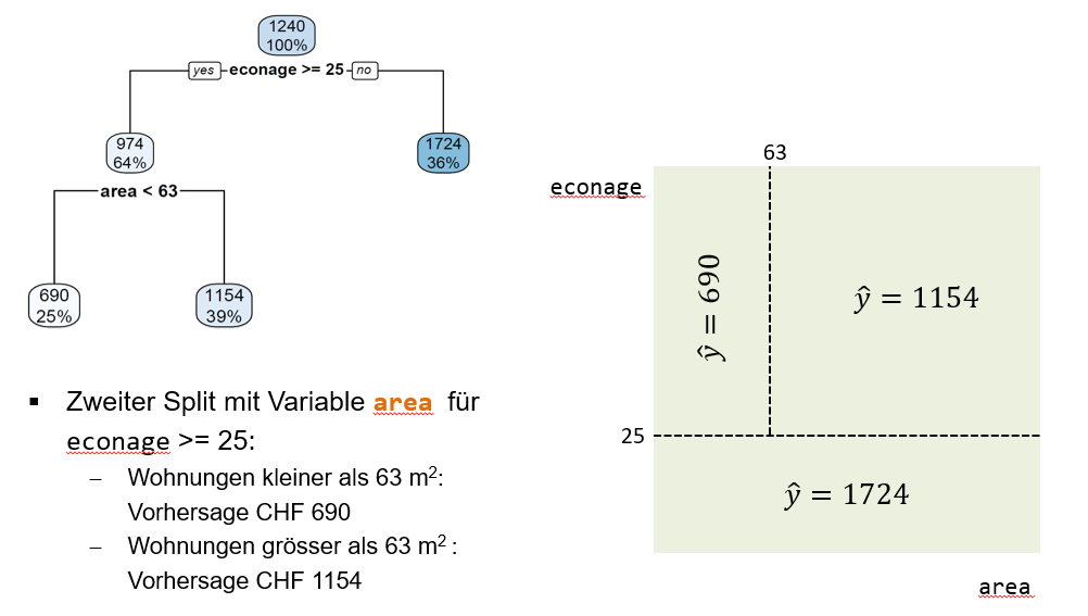 Der erste Split verwendet die Variable econage und den Splitpunkt 25. Alle Wohnungen, die min. 25 Jahre alt sind, gehen dem linken Branch entlang in den linken internen Node. Insgesamt landen so 64% der Trainingsbeobachtungen in diesem linken internen Node. Die durchschnittliche Miete für diese Beobachtungen beträgt CHF 974. Alle Wohnungen, die jünger als 25 Jahre alt sind, gehen dem rechten Branch entlang in den rechten internen Node. Das sind dementsprechend die restlichen 36% der Beobachtungen und deren mittlere Miete beträgt CHF 1724.