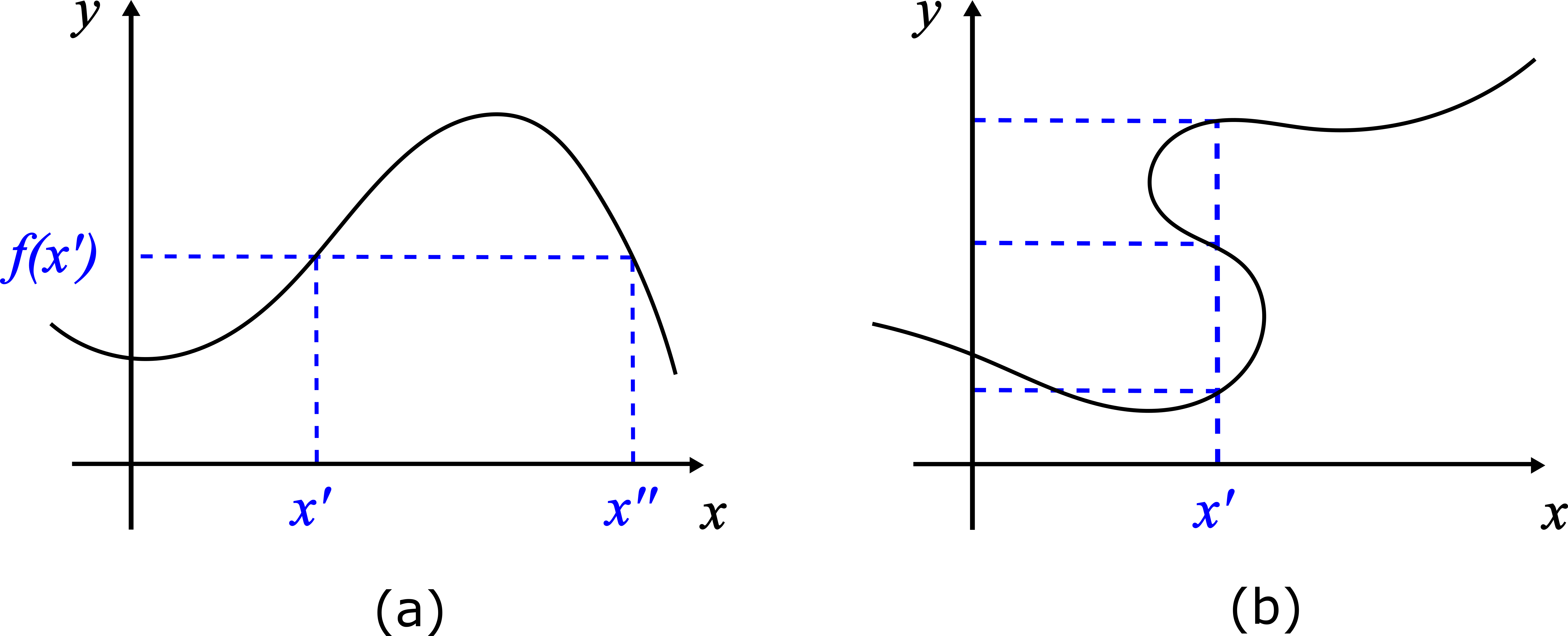 Wie eine Funktion grafisch aussieht, ist aus Panel (a) der Abbildung @ref(fig:functions) ersichtlich. Hier zeigen wir die Form einer Funktion in einem kartesischen Koordinatensystem. Die Funktionskurve weist jedem Wert \(x\) auf der x-Achse genau einen Wert \(y\) auf der y-Achse zu. Der wichtigste Teil der oben aufgeführten Definition ist der Teil “genau einen Wert”, denn eine Funktion kann einem Element \(x\) nicht zwei oder mehr Werte zuweisen, sondern nur genau einen. Genau aus diesem Grund handelt es sich bei Panel (b) in Abbildung @ref(fig:functions) nicht um eine Funktion, da gewissen \(x\)-Werten mehrere Werte \(y\) zugeordnet werden. Wichtig: das heisst aber nicht, dass zwei verschiedenen \(x\)-Werten, nennen wir sie \(x'\) und \(x''\), derselbe \(y\)-Wert zugeordnet werden kann (vgl. Panel (a)).
